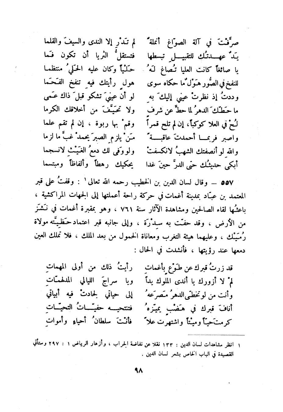 (1) انظر مشاهدات لسان الدين: 133 نقلاً عن نفاضة الجراب، وأزهار الرياض 1: 297 وستأتي القصيدة في الباب الخاص بشعر لسان الدين.