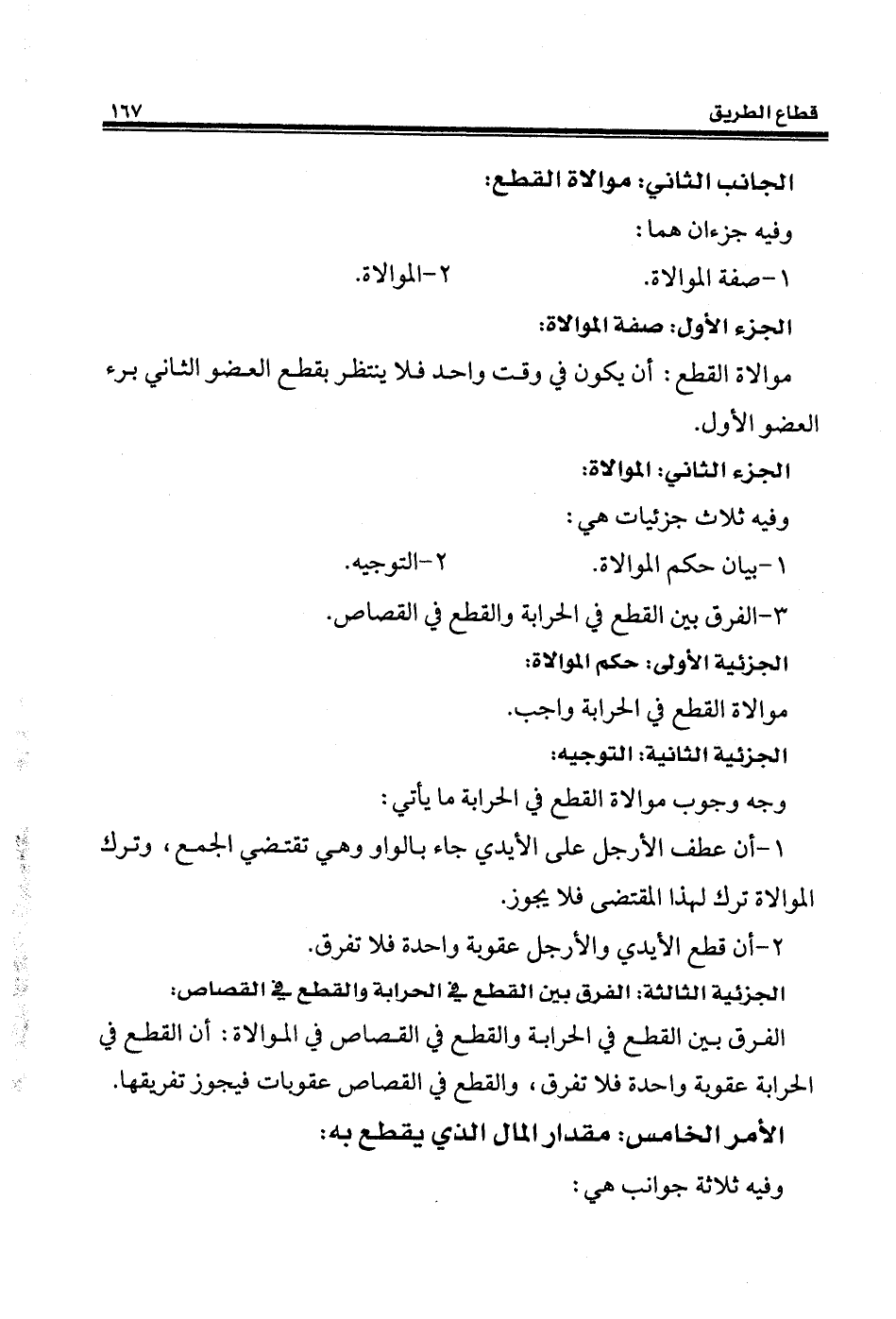 الفرق بين القطع في الحرابة والقطع في القصاص في الموالاة: أن القطع في الحرابة عقوبة واحدة فلا تفرق، والقطع في القصاص عقوبات فيجوز تفريقها.