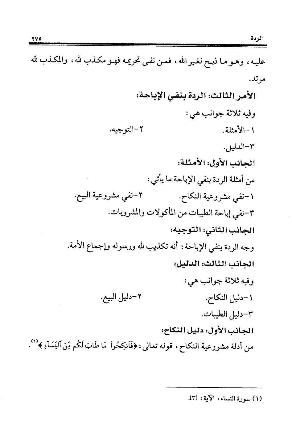 من أمثلة الردة بنفي الإباحة ما يأتي: