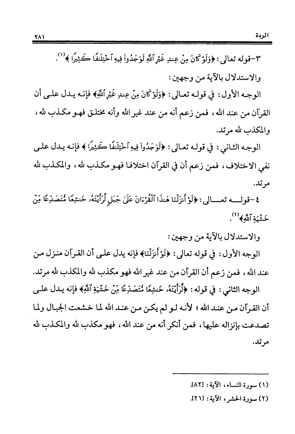 الوجه الأوّل: في قوله تعالى: {وَلَوْ كَانَ مِنْ عِنْدِ غَيْرِ اللَّهِ} فإنَّه يدلّ على أن القرآن من عند الله، فمن زعم أنَّه من عند غير الله وأنه مختلق فهو مكذب لله، والمكذب لله مرتد.