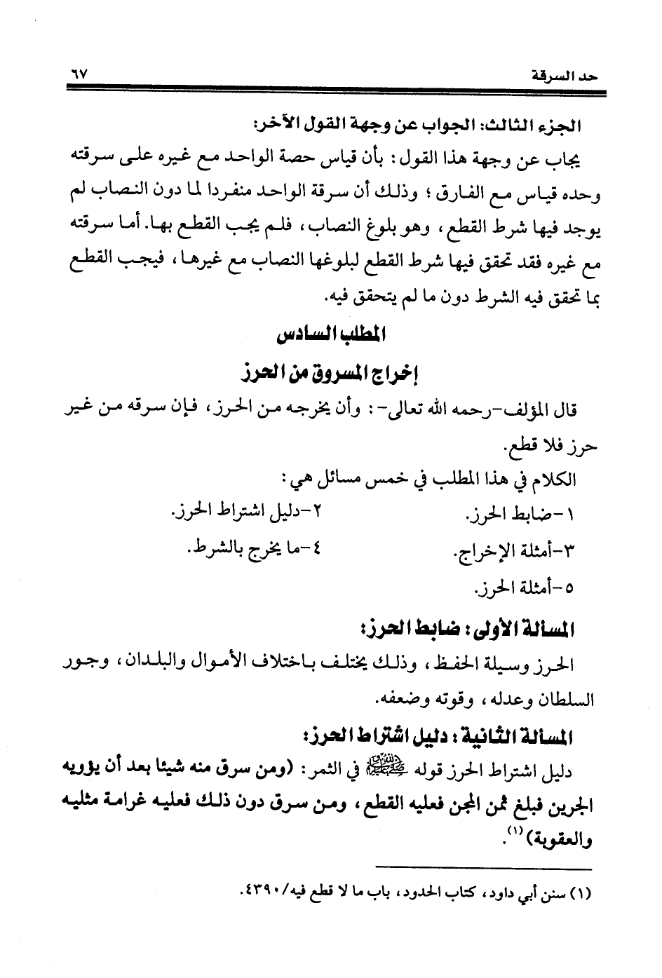 دليل اشتراط الحرز قوله - صلى الله عليه وسلم - في الثمر: (ومن سرق منه شيئًا بعد أن يؤويه الجرين فبلغ ثمن المجن فعليه القطع، ومن سرق دون ذلك فعليه غرامة مثليه والعقوبة) (¬1).