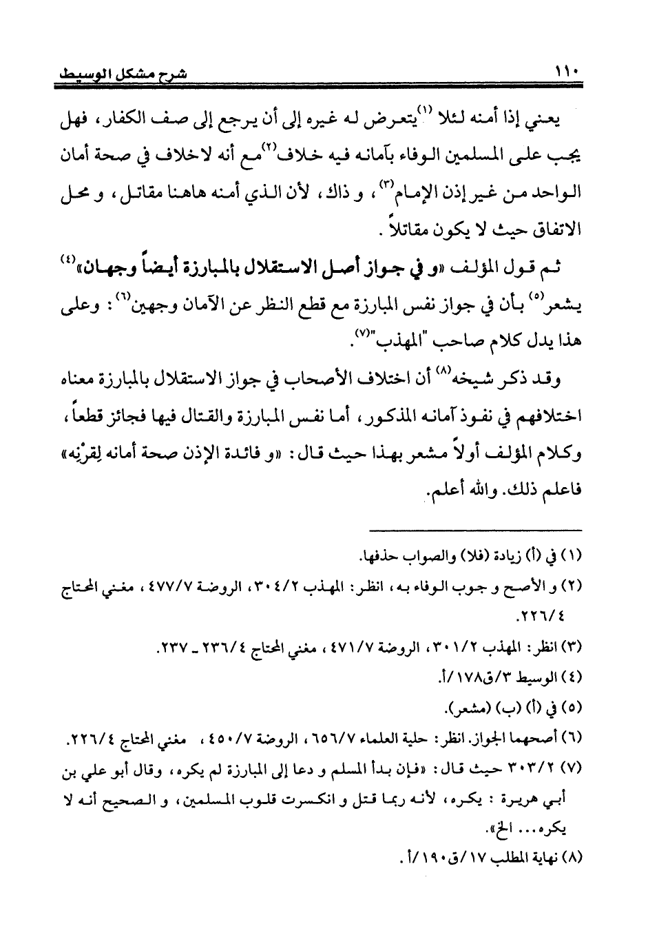 ثم قول المؤلف "وفي جواز أصل الاستقلال بالمبارزة أيضاً وجهان" (¬4) يشعر (¬5) بأن في جواز نفس المبارزة مع قطع النظر عن الآمان وجهين (¬6): وعلى هذا يدل كلام صاحب "المهذب" (¬7).