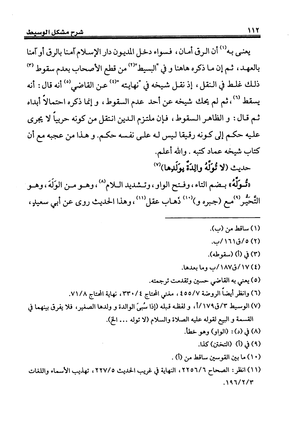 (¬7) الوسيط 3/ ق 179 / أ، ولفظه قبله (إذا سُبىَ الوالدة وولدها الصغير, فلا يفرق بينهما في القسمة والبيع لقوله عليه الصلاة والسلام (لا توله ... إلخ).