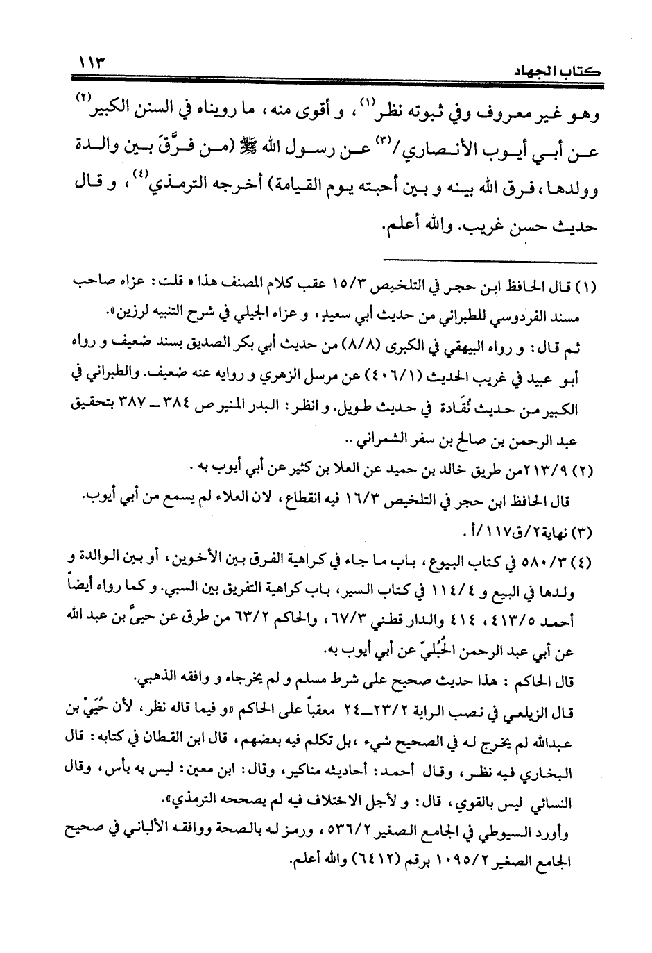 (¬4) 3/ 580 في كتاب البيوع، باب ما جاء في كراهية الفرق بين الأخوين، أو بين الوالدة وولدها في البيع و4/ 114 في كتاب السير، باب كراهية التفريق بين السبي. وكما رواه أيضاً أحمد 5/ 413، 414 والدارقطني 3/ 67، والحاكم 2/ 63 من طرق عن حييَّ بن عبد الله عن أبي عبد الرحمن الحُبُليّ عن أبي أيوب به.
