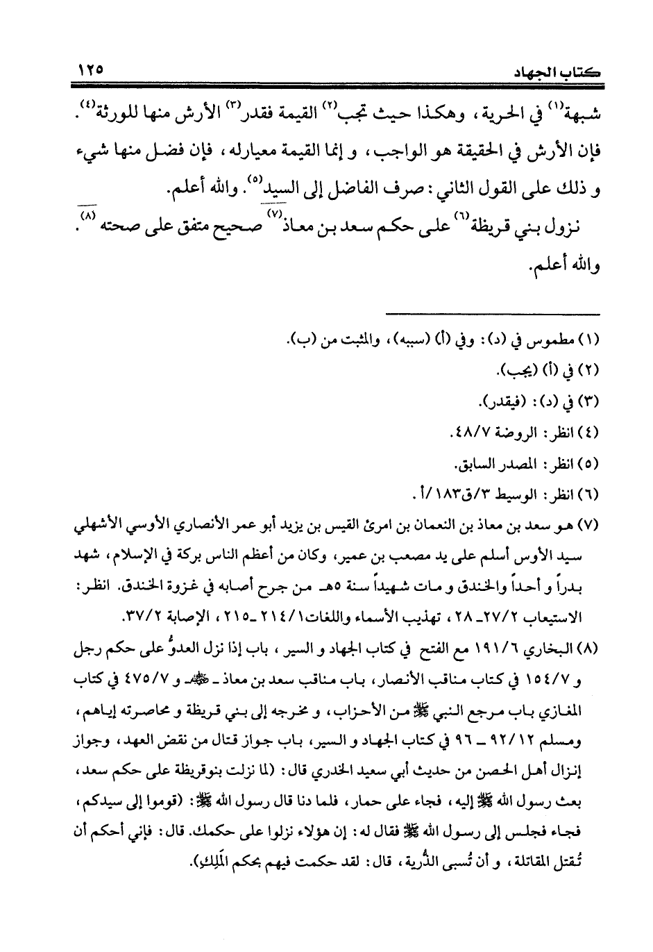 (¬8) البخاري 6/ 191 مع الفتح في كتاب الجهاد والسير، باب إذا نزل العدوُّ على حكم رجل و7/ 154 في كتاب مناقب الأنصار، باب مناقب سعد بن معاذ - رضي الله عنه - و7/ 475 في كتاب المغازي باب مرجع النبي - صلى الله عليه وسلم - من الأحزاب، ومخرجه إلى بني قريظة ومحاصرته إياهم، ومسلم 12/ 92 - 96 في كتاب الجهاد والسير، باب جواز قتال من نقض العهد، وجواز إنزال أهل الحصن من حديث أبي سعيد الخدري قال: (لما نزلت بنو قريظة على حكم سعد، بعث رسول الله - صلى الله عليه وسلم - إليه، فجاء على حمار، فلما دنا قال رسول الله - صلى الله عليه وسلم -: (قوموا إلى سيدكم، فجاء فجلس إلى رسول الله - صلى الله عليه وسلم - فقال له: إن هؤلاء نزلوا على حكمك. قال: فإني أحكم أن تُقتل المقاتلة، وأن تُسبى الذُّرية، قال: لقد حكمت فيهم بحكم المَلِكِ).