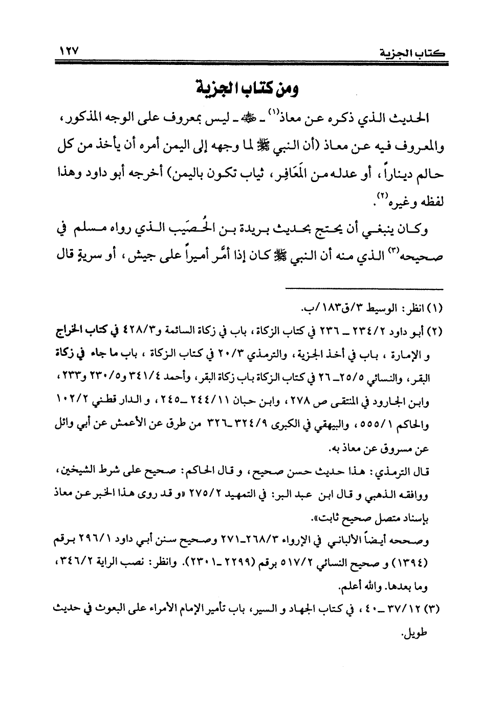(¬2) أبو داود 2/ 234 - 236 في كتاب الزكاة، باب في زكاة السائمة و3/ 428 في كتاب الخراج والإمارة، باب في أخذ الجزية، والترمذي 3/ 20 في كتاب الزكاة، باب ما جاء في زكاة البقر، والنسائي 5/ 25 - 26 في كتاب الزكاة باب زكاة البقر، وأحمد 4/ 341 و5/ 230 و233، وابن الجارود في المنتقى ص 278، وابن حبان 11/ 244 - 245، والدارقطني 2/ 102 والحاكم 1/ 555، والبيهقي في الكبرى 9/ 324 - 326 من طرق عن الأعمش عن أبي وائل عن مسروق عن معاذ به.
