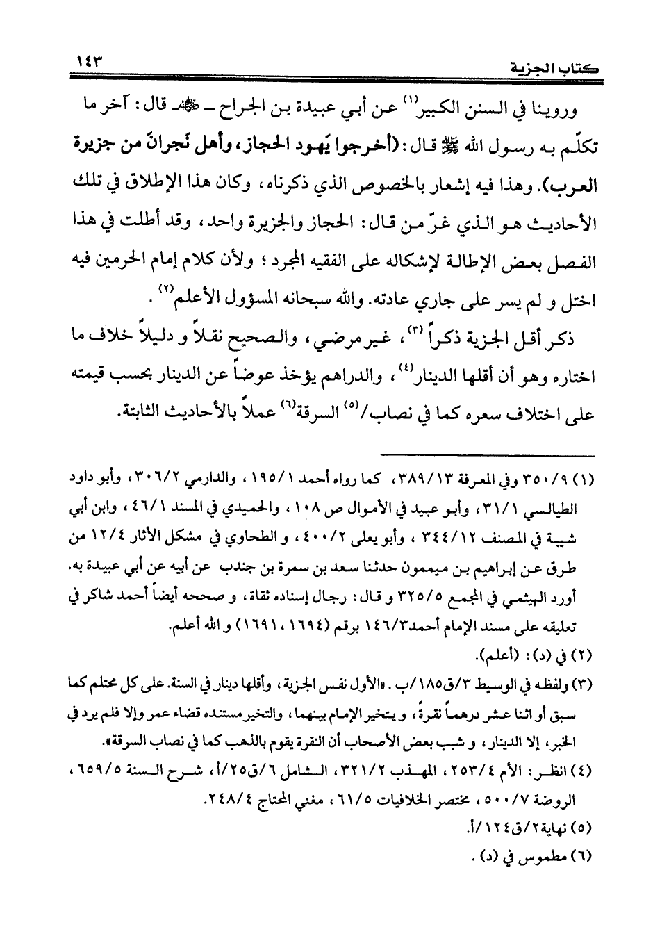ذكر أقل الجزية ذكراً (¬3)، غير مرضي، والصحيح نقلاً ودليلاً خلاف ما اختاره وهو أن أقلها الدينار (¬4)، والدراهم يؤخذ عوضاً عن الدينار بحسب قيمته على اختلاف سعره كما في نصاب (¬5) السرقة (¬6) عملاً بالأحاديث الثابتة.