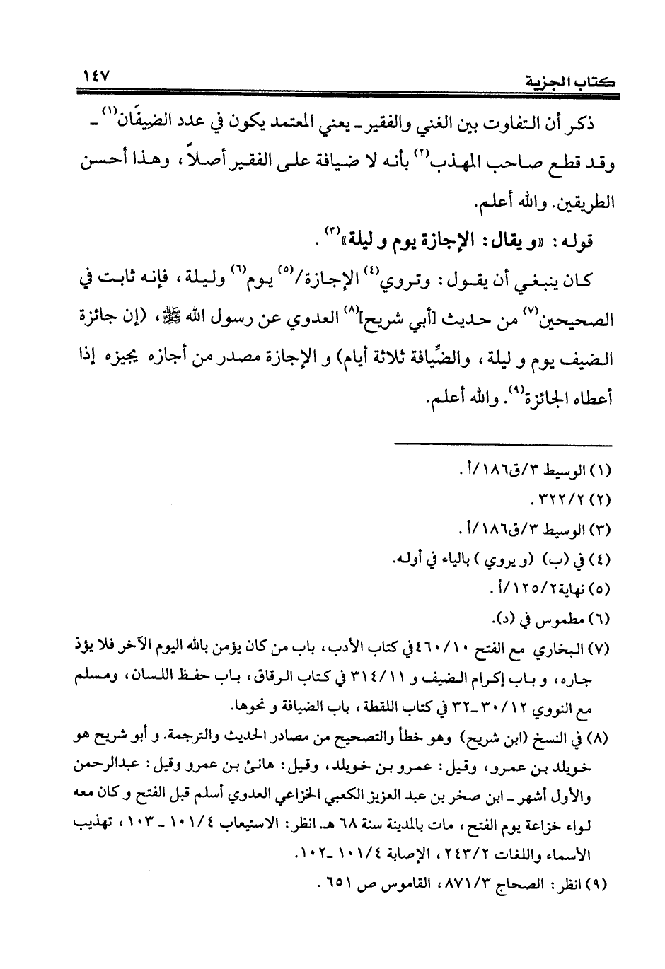 كان ينبغي أن يقول: وتروي (¬4) الإجازة (¬5) يوم (¬6) وليلة، فإنه ثابت في الصحيحين (¬7) من حديث [أبي شريح] (¬8) العدوي عن رسول الله - صلى الله عليه وسلم -، (إن جائزة الضيف يوم وليلة، والضِّيافة ثلاثة أيام) والإجازة مصدر من أجازه يجيزه إذا أعطاه الجائزة (¬9). والله أعلم.