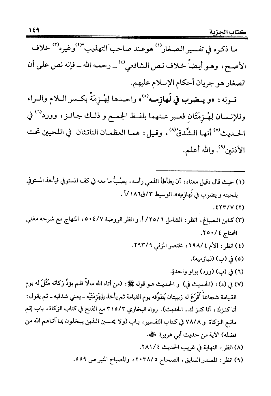 (¬1) حيث قال "قيل معناه: أن يطأطأ الذمي رأسه، يصُبُّ ما معه في كف المستوفي فيأخذ المستوفي بلحيته ويضرب في لَهازِمِه". الوسيط 3/ ق 186/ أ.