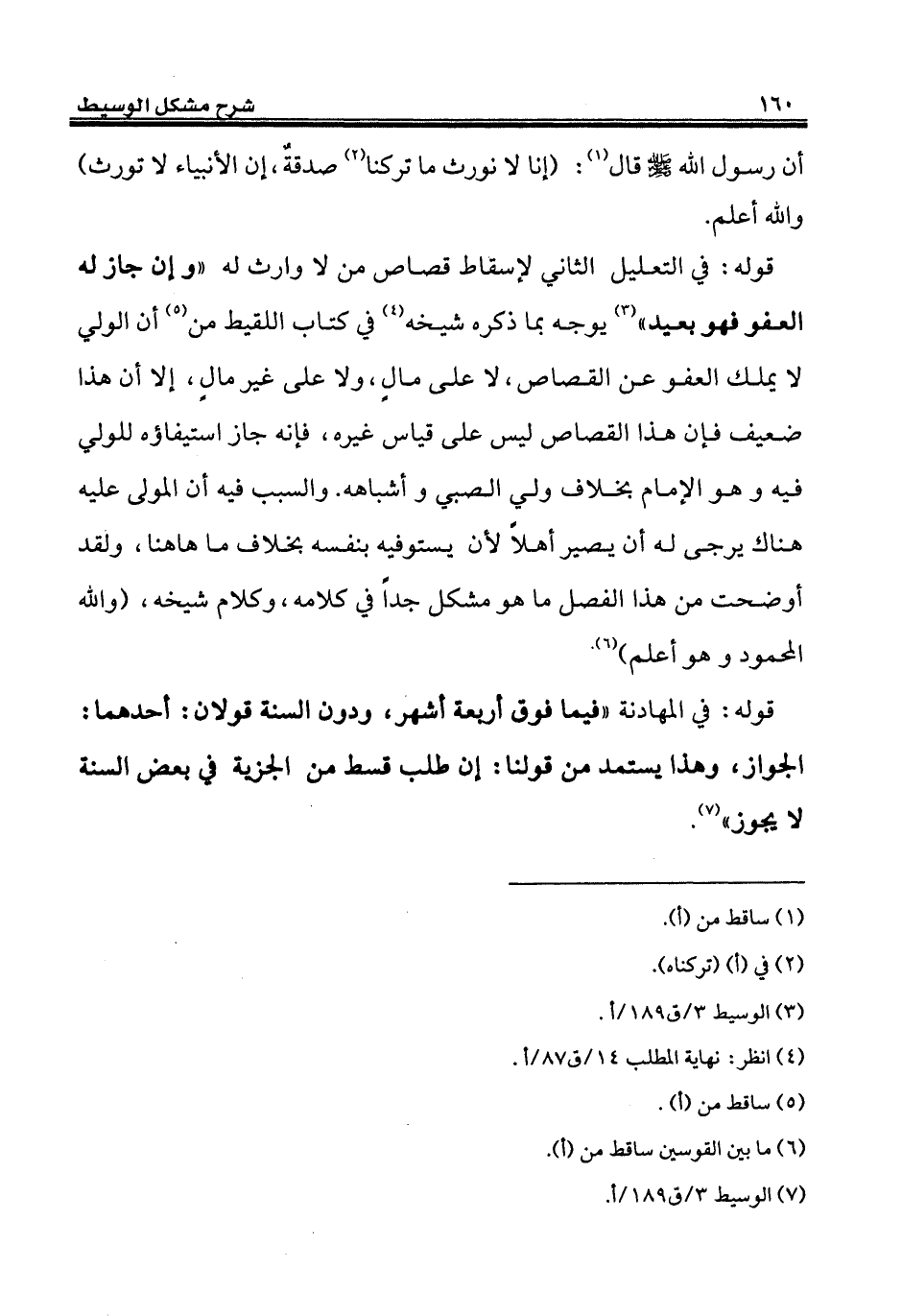 قوله: في التعليل الثاني لإسقاط قصاص من لا وارث له "وإن جاز له العفو فهو بعيد" (¬3) يوجه بما ذكره شيخه (¬4) في كتاب اللقيط من (¬5) أن الولي لا يملك العفو عن القصاص، لا على مالٍ، ولا على غير مالٍ، إلا أن هذا ضعيف فإن هذا القصاص ليس على قياس غيره، فإنه جاز استيفاؤه للولي فيه وهو الإمام بخلاف ولي الصبي وأشباهه. والسبب فيه أن المولى عليه هناك يرجى له أن يصير أهلاً لأن يستوفيه بنفسه بخلاف ما ها هنا، ولقد أوضحت من هذا الفصل ما هو مشكل جداً في كلامه، وكلام شيخه، (والله المحمود وهو أعلم) (¬6)