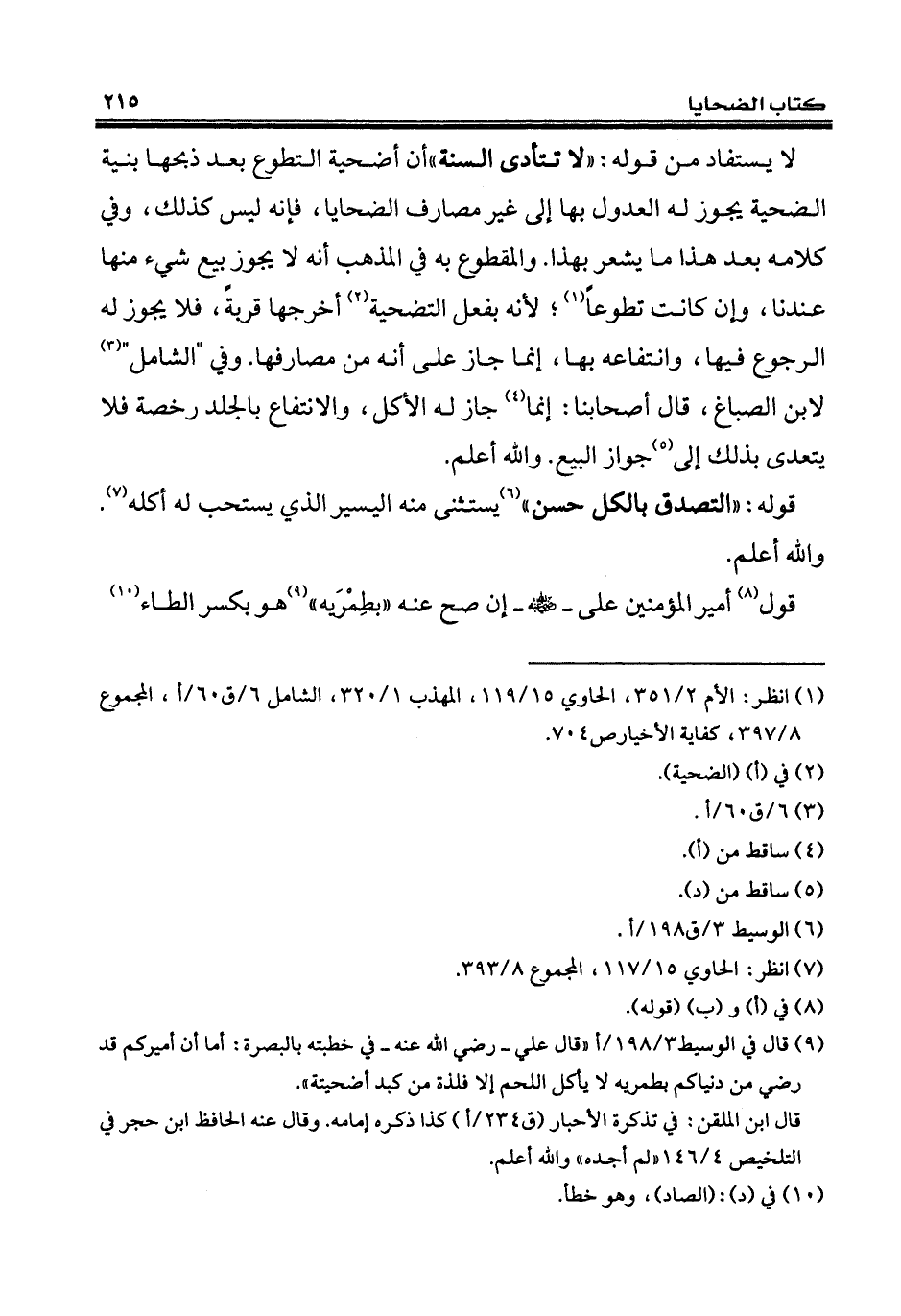 لا يستفاد من قوله: "لا تتأدى السنة" أن أضحية التطوع بعد ذبحها بنية الضحية يجوز له العدول بها إلى غير مصارف الضحايا، فإنه ليس كذلك، وفي كلامه بعد هذا ما يشعر بهذا. والمقطوع به في المذهب أنه لا يجوز بيع شيء منها عندنا، وإن كانت تطوعاً (¬1)؛ لأنه بفعل التضحية (¬2) أخرجها قربةً، فلا يجوز له الرجوع فيها، وانتفاعه بها، إنما جاز على أنه من مصارفها. وفي "الشامل" (¬3) لابن الصباغ، قال أصحابنا: إنما (¬4) جاز له الأكل، والانتفاع بالجلد رخصة فلا يتعدى بذلك إلى (¬5) جواز البيع. والله أعلم.