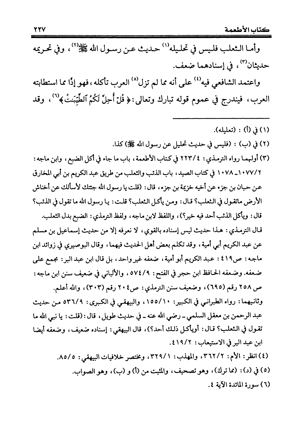 وأما الثعلب فليس في تحليله (¬1) حديث عن رسول الله - صلى الله عليه وسلم - (¬2)، وفي تحريمه حديثان (¬3)، في إسنادهما ضعف.