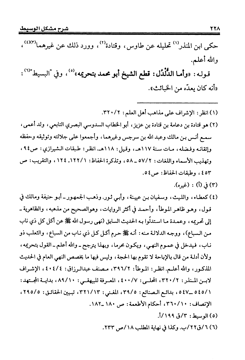 (¬4) كعطاء، والليث، وسفيان بن عيينة، وأبي ثور. وذهب الجمهور - أبو حنيفة ومالك في قول، وهو ظاهر الموطأ، وأحمد في أكثر الروايات، وهو الصحيح من مذهبه، والظاهرية - إلى تحريمه، وعمدة ما استدلّوا به الحديث السابق (نهى رسول الله - صلى الله عليه وسلم - عن أكل كل ذي ناب من السباع)، ووجه الدلالة منه: أنه - صلى الله عليه وسلم - حرم أكل كل ذي ناب من السباع، والثعلب ذو ناب، فيدخل في عموم النهي، ويكون محرما، وبهذا يترجح - والله أعلم - القول بتحريمه، ولأن أدلة من قال بالإباحة لا تقوم بها الحجة، وليس فيها ما يخصص النهي العام في الحديث المذكور، والله أعلم. انظر: الموطأ: 2/ 396، مصنف عبد الرزاق: 4/ 404، الإشراف لابن المنذر: 2/ 320، المحلى: 7/ 400، المعرفة للبيهقي: 10/ 89، بداية المجتهد: 1/ 545 - 547، بدائع الصنائع: 5/ 39، المغني: 13/ 321، تبيين الحقائق: 5/ 295، الإنصاف: 10/ 360، أحكام الأطعمة: ص 180 - 182.