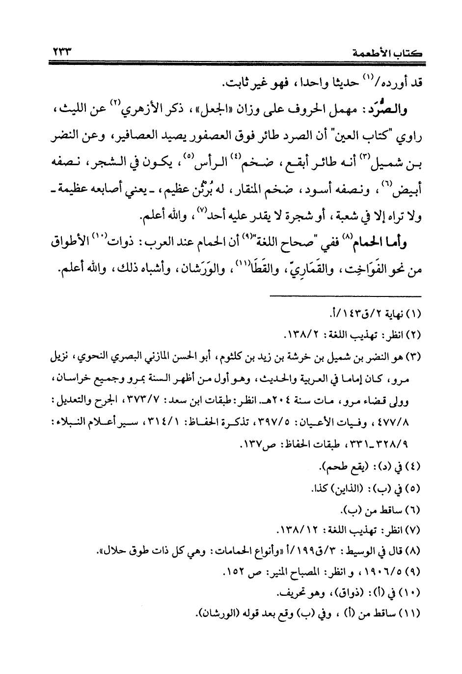 (¬3) هو النضر بن شميل بن خرشة بن زيد بن كلثوم، أبو الحسن المازني البصري النحوي، نزيل مرو، كان إماما في العربية والحديث، وهو أول من أظهر السنة بمرو وجميع خراسان، وولى قضاء مرو، مات سنة 204 هـ. انظر: طبقات ابن سعد: 7/ 373، الجرح والتعديل: 8/ 477، وفيات الأعيان: 5/ 397، تذكرة الحفاظ: 1/ 314، سير أعلام النبلاء: 9/ 328 - 331، طبقات الحفاظ: ص 137.