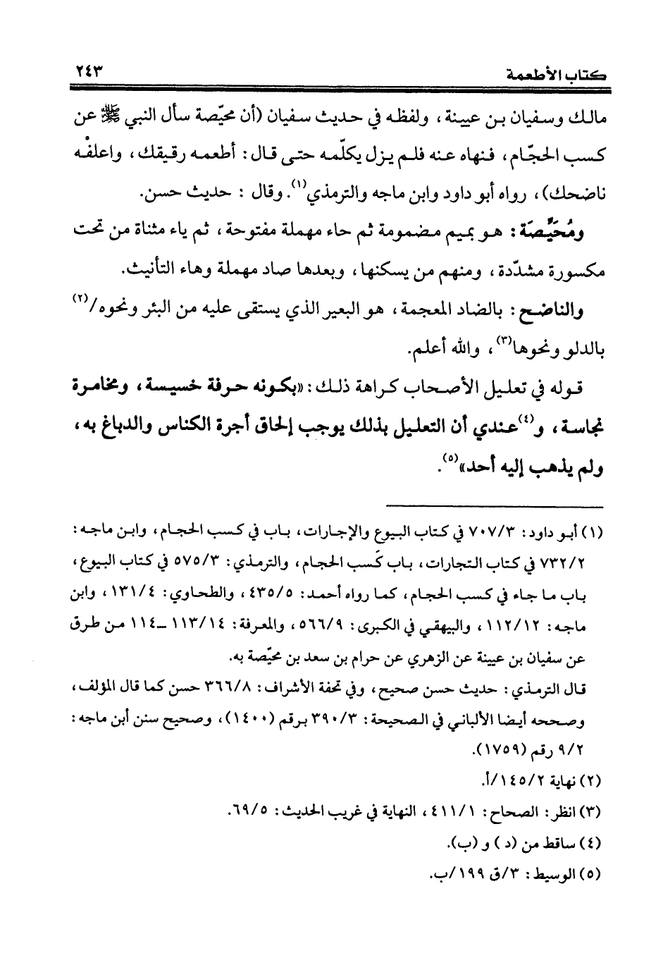 مالك وسفيان بن عيينة، ولفظه في حديث سفيان (أن محيّصة سأل النبي - صلى الله عليه وسلم - عن كسب الحجّام، فنهاه عنه فلم يزل يكلّمه حتى قال: أطعمه رقيقك، واعلفْه ناضحك)، رواه أبو داود وابن ماجه والترمذي (¬1). وقال: حديث حسن.