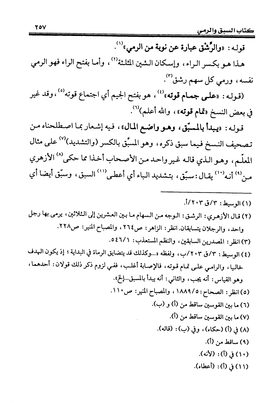 (¬4) الوسيط: 3/ ق 203/ ب، ولفظه " ... وكذلك قد يتضايق الرماة في البداية؛ إذ يكون الهدف خاليا، والرامي على تمام قوته، فالإصابة أغلب، ففي لزوم ذكر ذلك قولان: أحدهما، وهو القياس: أنه يجب، والثاني: أنه يبدأ بالمسبق ... إلخ".