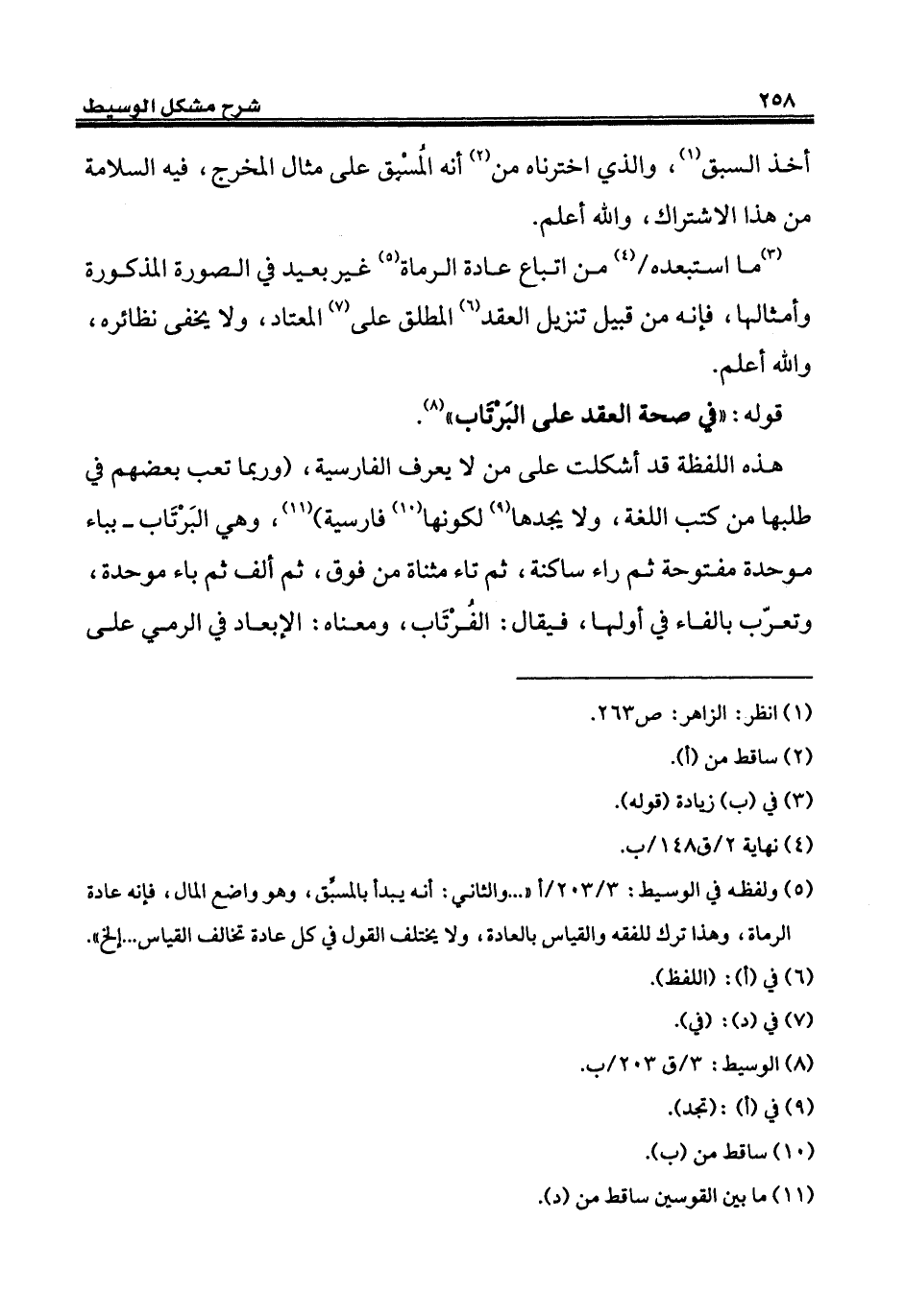 (¬5) ولفظه في الوسيط: 3/ 203/ أ " ... والثاني: أنه يبدأ بالمسبَّق، وهو واضع المال، فإنه عادة الرماة، وهذا ترك للفقه والقياس بالعادة، ولا يختلف القول في كل عادة تخالف القياس ... إلخ".
