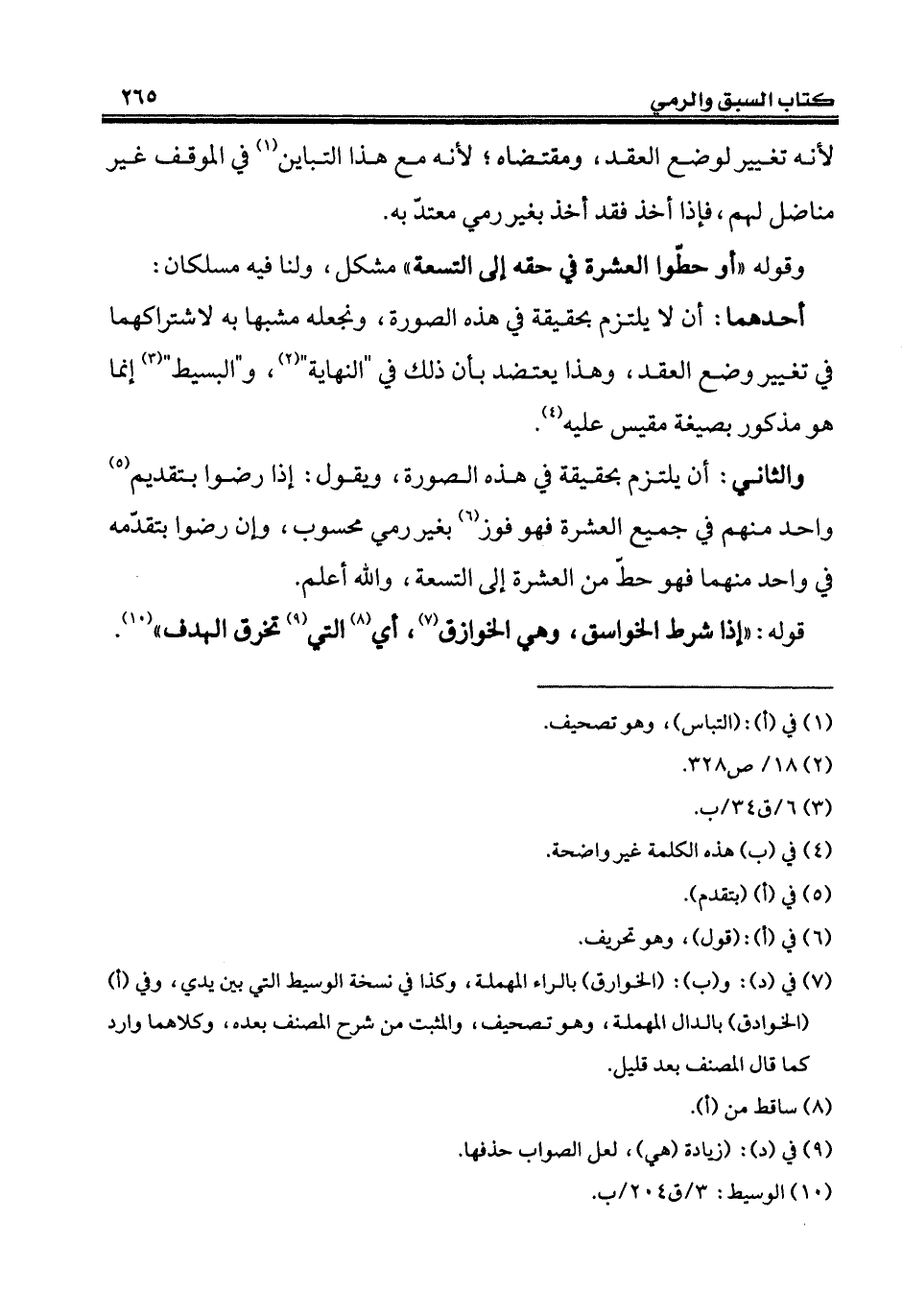 والثاني: أن يلتزم بحقيقة في هذه الصورة، ويقول: إذا رضوا بتقديم (¬5) واحد منهم في جميع العشرة فهو فوز (¬6) بغير رمي محسوب، وإن رضوا بتقدّمه في واحد منهما فهو حطّ من العشرة إلى التسعة، والله أعلم.