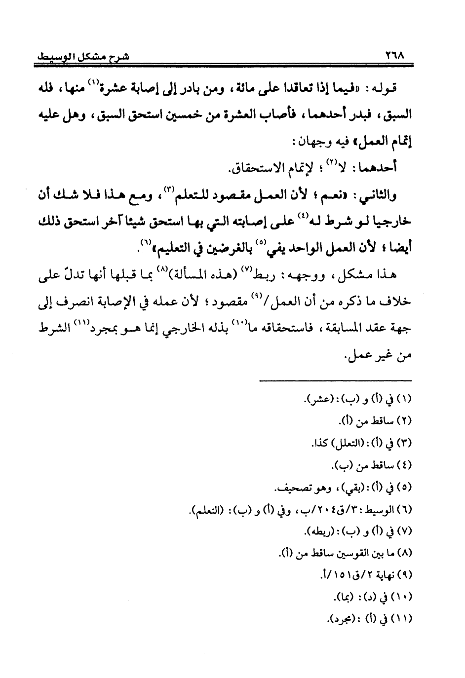 هذا مشكل، ووجهه: ربط (¬7) (هذه المسألة) (¬8) بما قبلها أنها تدلّ على خلاف ما ذكره من أن العمل (¬9) مقصود؛ لأن عمله في الإصابة انصرف إلى جهة عقد المسابقة، فاستحقاقه ما (¬10) بذله الخارجي إنما هو بمجرد (¬11) الشرط من غير عمل.