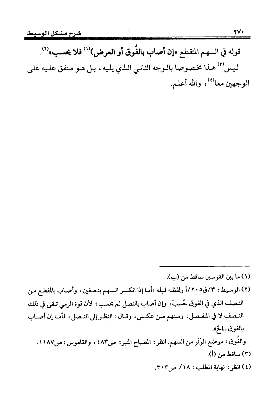 (¬2) الوسيط: 3/ ق 205/ أولفظه قبله "أما إذا انكسر السهم بنصفين، وأصاب بالمقطع من النصف الذي في الفوق حُسِبَ، وإن أصاب بالنصل لم يحسب؛ لأن قوة الرمي تبقى في ذلك النصف لا في المنفصل، ومنهم من عكس، وقال: النظر إلى النصل، فأما إن أصاب بالفوق ... إلخ".