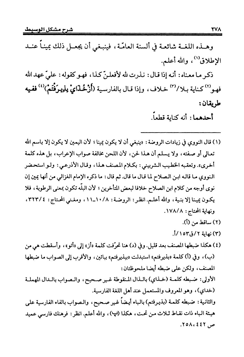 (¬1) قال النووي في زيادات الروضة: "ينبغي أن لا يكون يمينا؛ لأن اليمين لا يكون إلا باسم الله تعالى أو صفته، ولا يسلم أن هذا لحن, لأن اللحن مخالفة صواب الإعراب، بل هذه كلمة أخرى". وتعقبه الخطيب الشربيني: بكلام المصنف هذا، وقال الأذرعي: ولو استحضر النووي ما قاله ابن الصلاح لما قال ما قال. ثم قال: ما ذكره الإِمام الغزالي من أنها يمين ان نوى أوجه من كلام ابن الصلاح خلافا لبعض المتأخرين؛ لأن البلّه تكون بمعنى الرطوبة، فلا يكون يمينا إلا بنية، والله أعلم. انظر: الروضة: 8/ 10 - 11، ومغني المحتاج: 4/ 323، ونهاية المحتاج: 8/ 178.