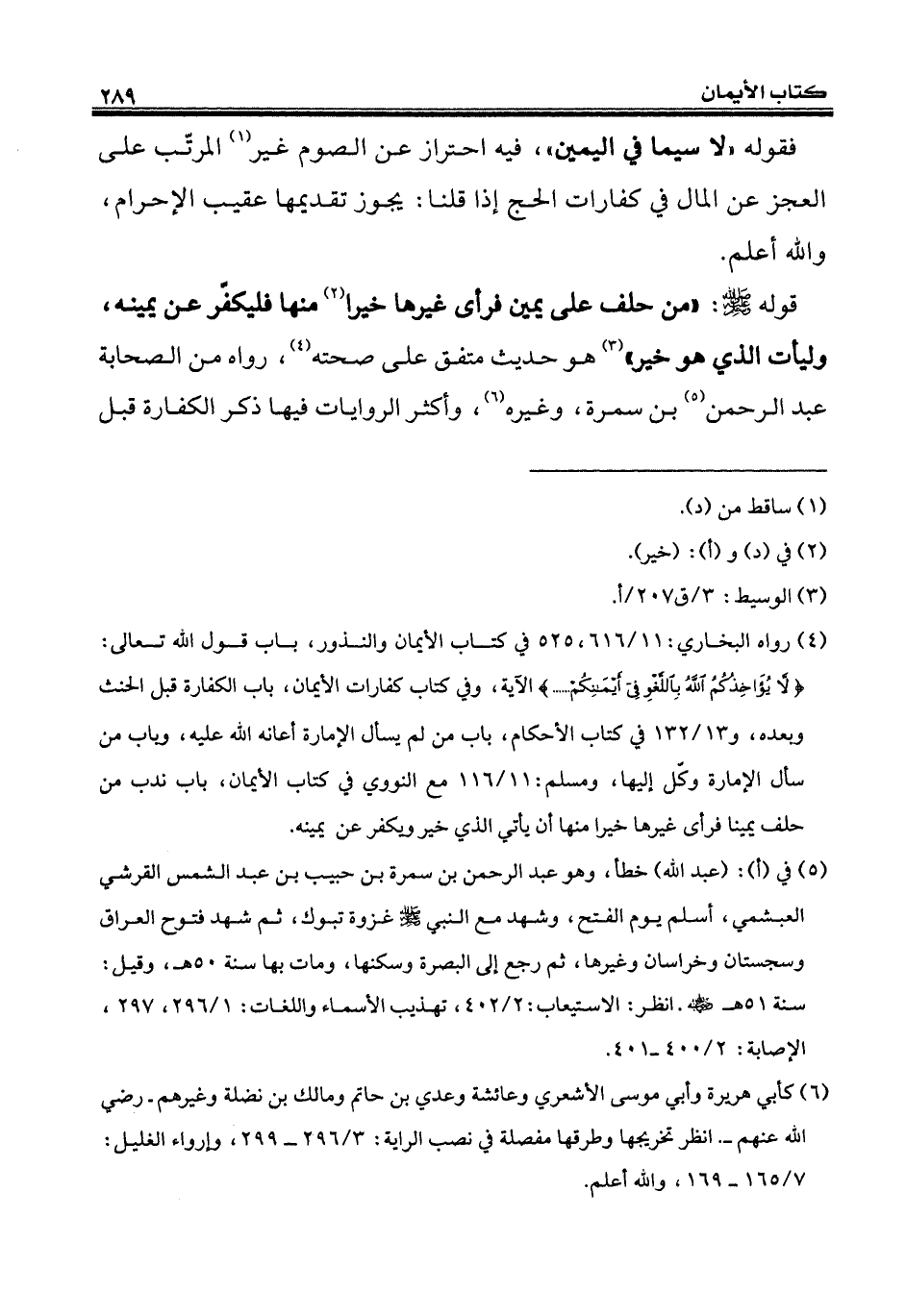 (¬4) رواه البخاري: 11/ 616، 525 في كتاب الإيمان والنذور، باب قول الله تعالى: {لَا يُؤَاخِذُكُمُ اللَّهُ بِاللَّغْوِ فِي أَيْمَانِكُمْ ...} الآية، وفي كتاب كفارات الأيمان، باب الكفارة قبل الحنث وبعده، و 13/ 132 في كتاب الأحكام، باب من لم يسأل الإمارة أعانه الله عليه، وباب من سأل الإمارة وكّل إليها، ومسلم: 11/ 116 مع النووي في كتاب الأيمان، باب ندب من حلف يمينا فرأى غيرها خيرا منها أن يأتي الذي خير ويكفر عن يمينه