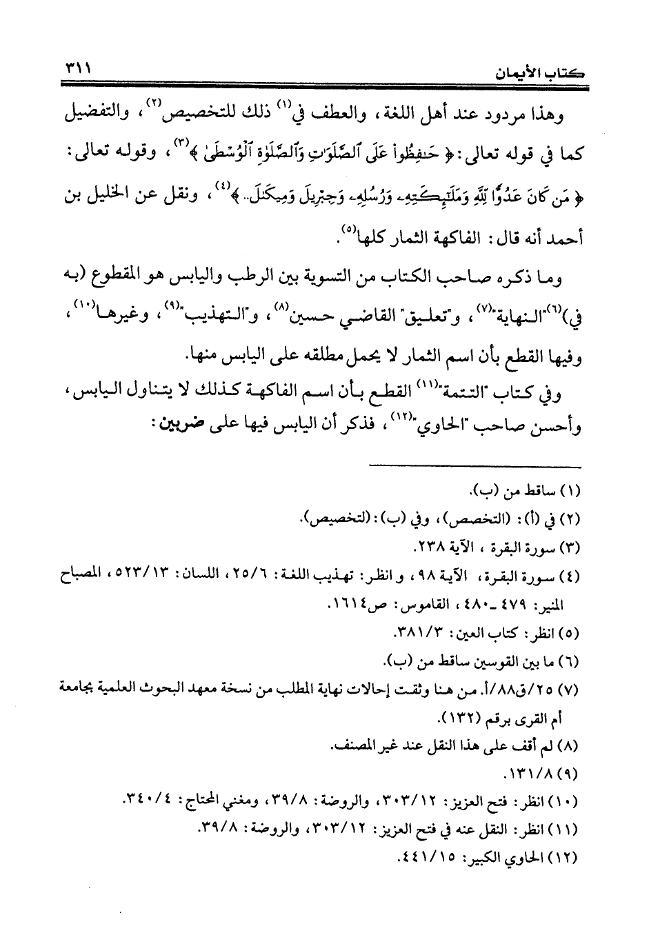 وهذا مردود عند أهل اللغة، والعطف في (¬1) ذلك للتخصيص (¬2)، والتفضيل كما في قوله تعالى: {حَافِظُوا عَلَى الصَّلَوَاتِ وَالصَّلَاةِ الْوُسْطَى} (¬3)، وقوله تعالى: {مَنْ كَانَ عَدُوًّا لِلَّهِ وَمَلَائِكَتِهِ وَرُسُلِهِ وَجِبْرِيلَ وَمِيكَالَ ....} (¬4)، ونقل عن الخليل بن أحمد أنه قال: الفاكهة الثمار كلها (¬5).