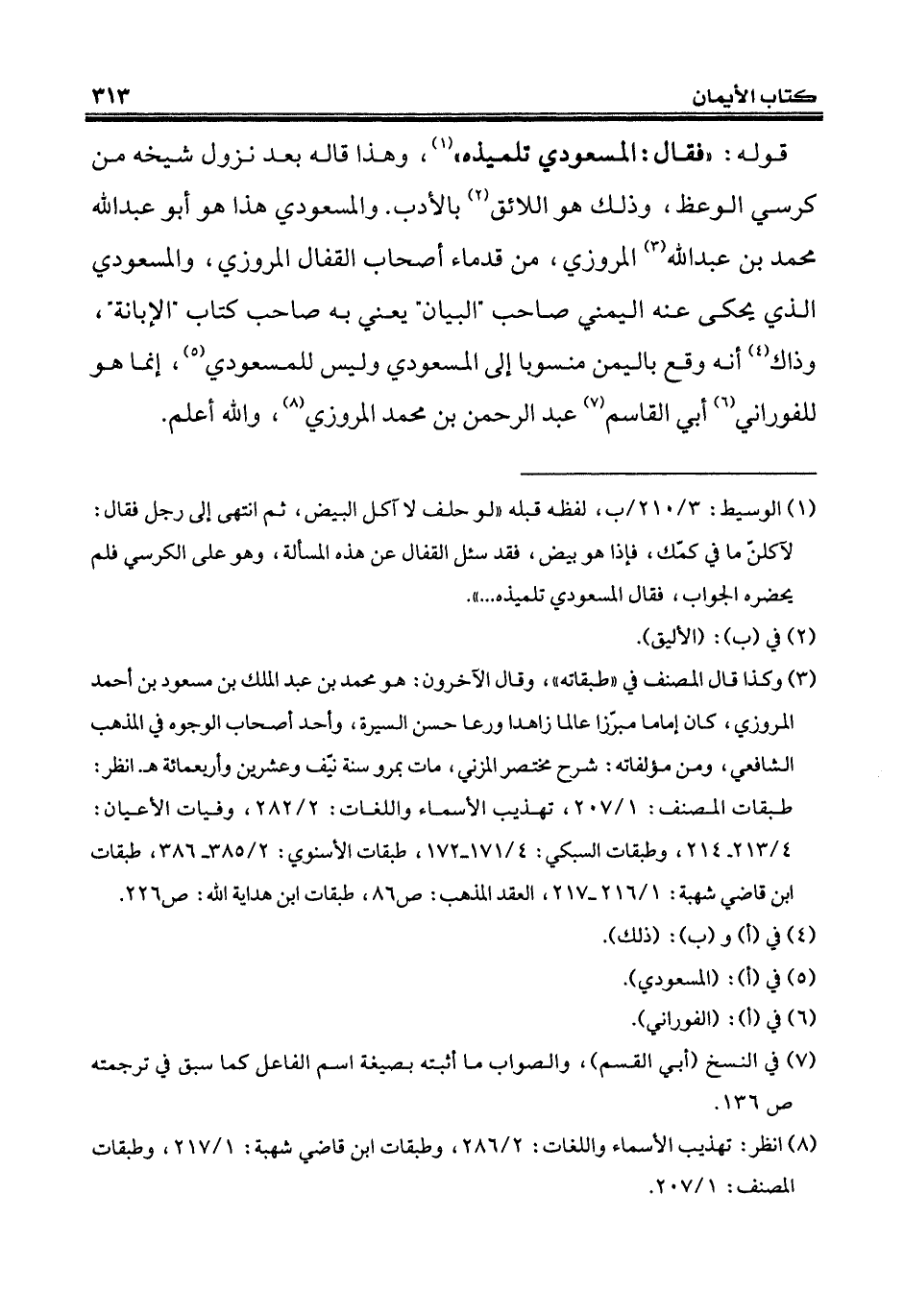 قوله: "فقال: المسعودي تلميذه" (¬1)، وهذا قاله بعد نزول شيخه من كرسي الوعظ، وذلك هو اللائق (¬2) بالأدب. والمسعودي هذا هو أبو عبد الله محمَّد بن عبد الله (¬3) المروزي، من قدماء أصحاب القفال المروزي، والمسعودي الذي يحكى عنه اليمني صاحب "البيان" يعني به صاحب كتاب "الإبانة"، وذاك (¬4) أنه وقع باليمن منسوبا إلى المسعودي وليس للمسعودي (¬5)، إنما هو للفوراني (¬6) أبي القاسم (¬7) عبد الرحمن بن محمَّد المروزي (¬8)، والله أعلم.