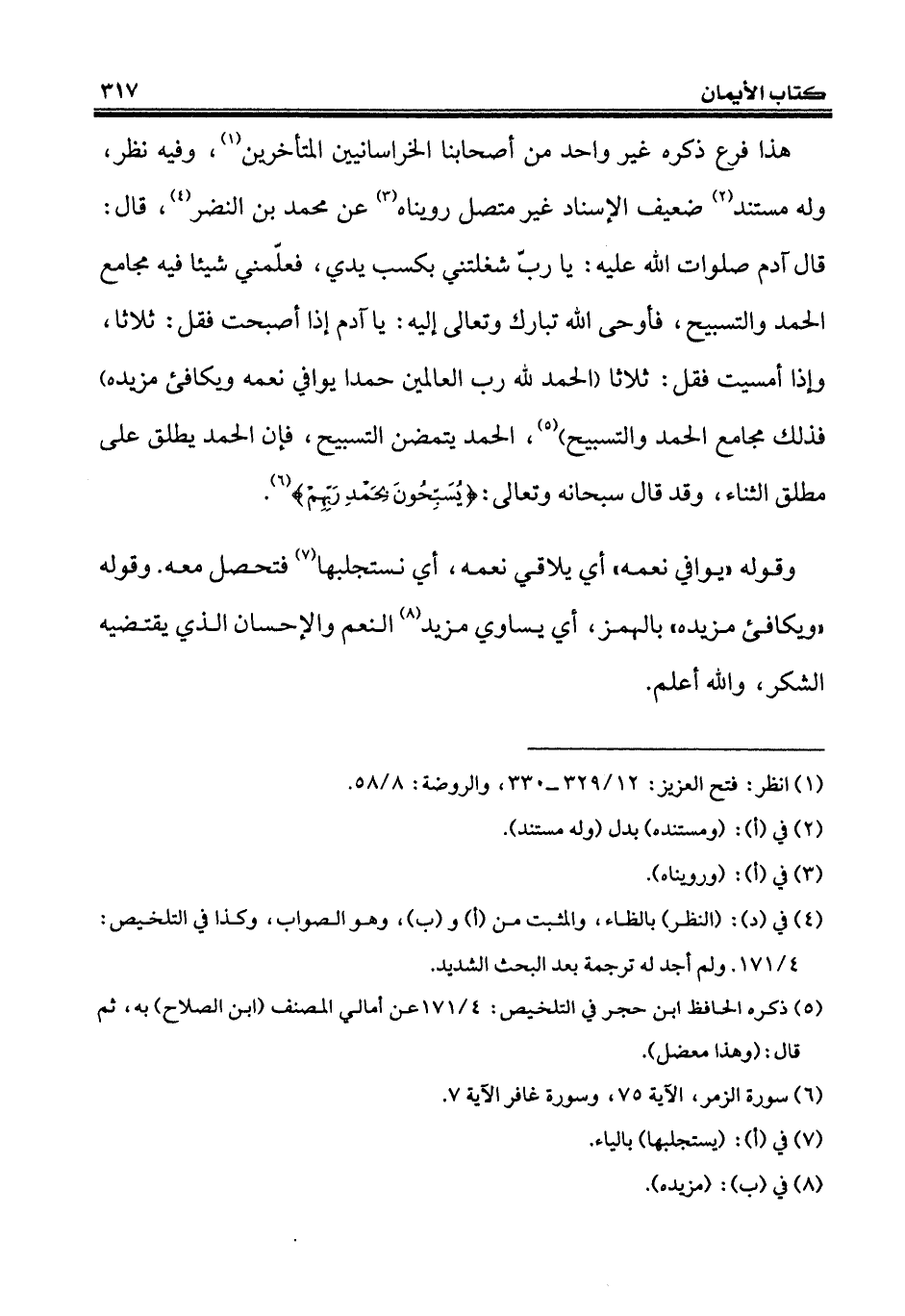 هذا فرع ذكره غير واحد من أصحابنا الخراسانيين المتأخرين (¬1)، وفيه نظر، وله مستند (¬2) ضعيف الإسناد غير متصل رويناه (¬3) عن محمَّد بن النضر (¬4)، قال: قال آدم صلوات الله عليه: يا ربّ شغلتني بكسب يدي، فعلّمني شيئاً فيه مجامع الحمد والتسبيح، فأوحى الله تبارك وتعالى إليه: يا آدم إذا أصبحت فقل: ثلاثا، وإذا أمسيت فقل: ثلاثًا (الحمد لله رب العالمين حمدا يوافي نعمه ويكافئ مزيده) فذلك مجامع الحمد والتسبيح) (¬5)، الحمد يتضمن التسبيح، فإن الحمد يطلق على مطلق الثناء، وقد قال سبحانه وتعالى: {يُسَبِّحُونَ بِحَمْدِ رَبِّهِمْ} (¬6).