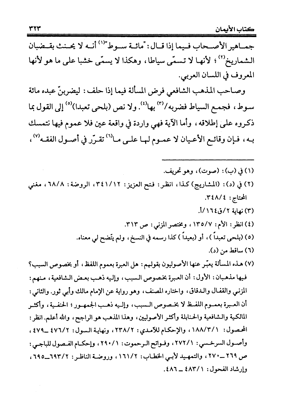 وصاحب المذهب الشافعي فرض المسألة فيما إذا حلف: ليضربنّ عبده مائة سوط، فجمع السياط فضربه (¬3) بها (¬4). ولا نص (بلحى تعبدا) (¬5) إلى القول بما ذكروه على إطلاقه، وأما الآية فهي واردة في واقعة عين فلا عموم فيها نتمسك به، فإن وقائع الأعيان لا عموم لها على ما (¬6) تقرّر في أصول الفقه (¬7)،