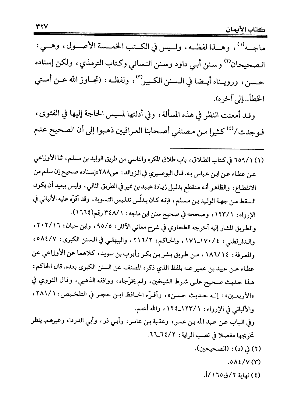 (¬1) 1/ 659 في كتاب الطلاق، باب طلاق المكره والناسي من طريق الوليد بن مسلم، ثنا الأوزاعي عن عطاء عن ابن عباس به. قال البوصيري في الزوائد: ص 288 "إسناده صحيح إن سلم من الانقطاع، والظاهر أنه منقطع بدليل زيادة عبيد بن نمير في الطريق الثاني، وليس ببعيد أن يكون السقط من جهة الوليد بن مسلم، فإنه كان يدلّس تدليس التسوية، وقد أقرّه عليه الألباني في الإرواء: 1/ 123، وصححه في صحيح سنن ابن ماجه: 1/ 348 رقم (1664).