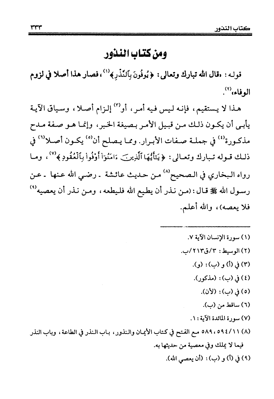 قوله: "قال الله تبارك وتعالى: {يُوفُونَ بِالنَّذْرِ} (¬1)، فصار هذا أصلاً في لزوم الوفاء" (¬2).