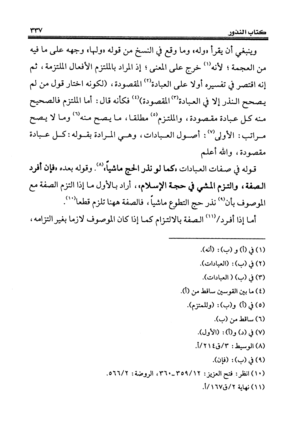 قوله في صفات العبادات "كما لو نذر الحج ماشياً" (¬8). وقوله بعده "فإن أفرد الصفة، والتزم المشي في حجة الإسلام"، أراد بالأول ما إذا التزم الصفة مع الموصوف بأن (¬9) نذر حج التطوع ماشياً، فالصفة ههنا تلزم قطعا (¬10).