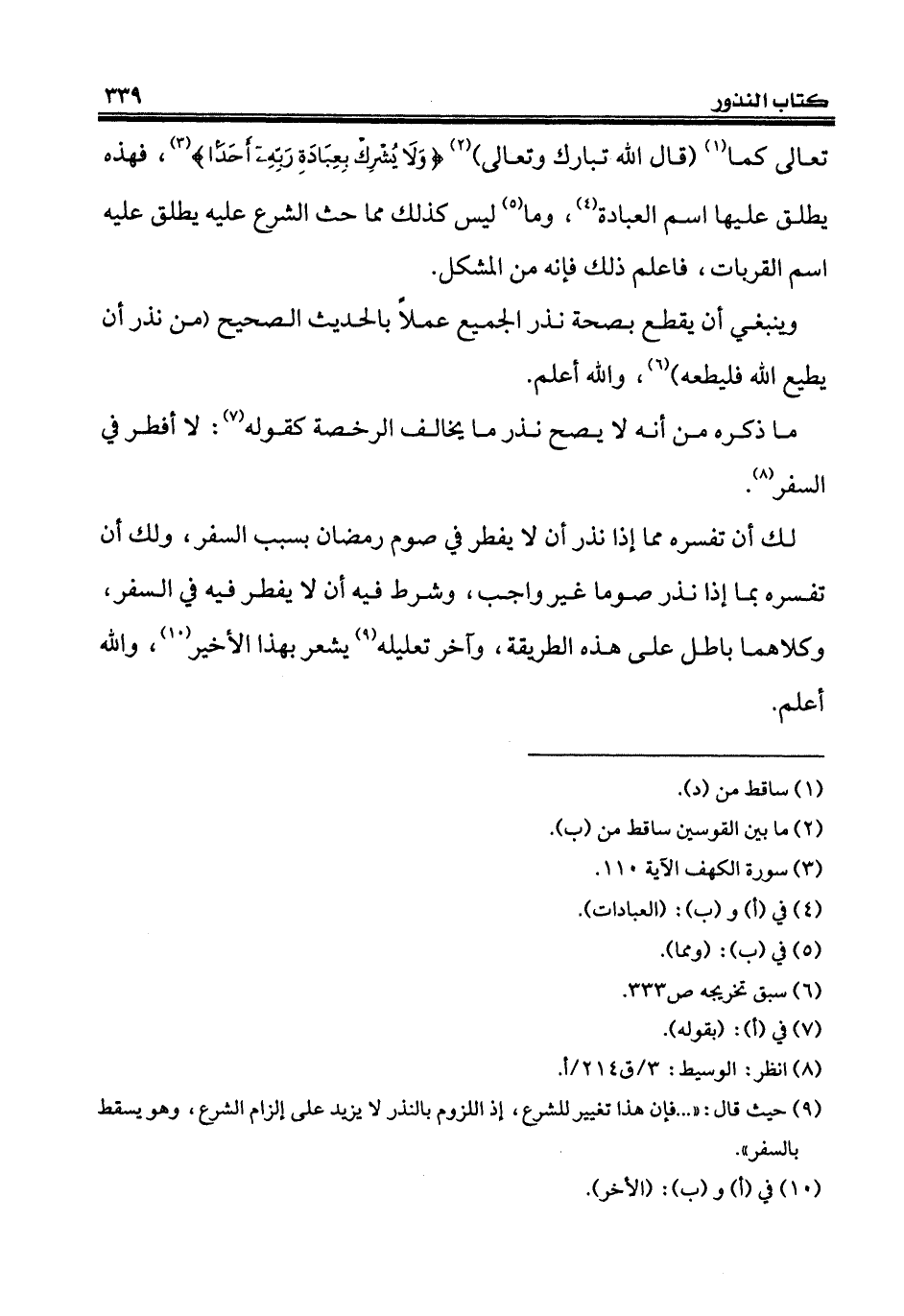 (¬9) حيث قال: " ... فإن هذا تغيير للشرع، إذ اللزوم بالنذر لا يزيد على إلزام الشرع، وهو يسقط بالسفر".