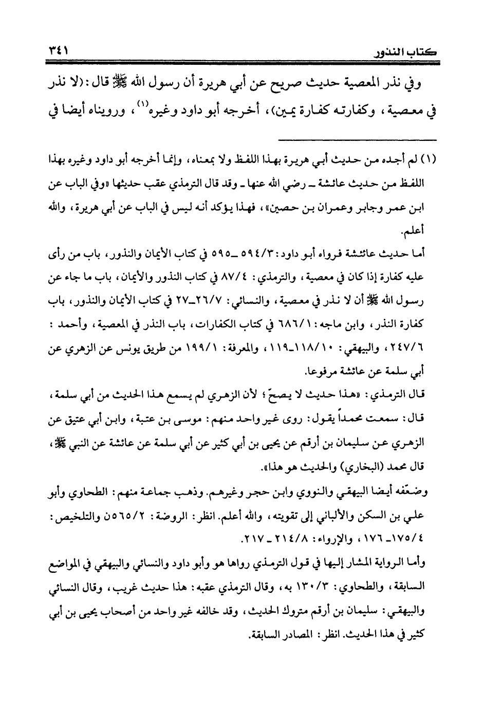 وفي نذر المعصية حديث صريح عن أبي هريرة أن رسول الله - صلى الله عليه وسلم - قال: (لا نذر في معصية، وكفارته كفارة يمين)، أخرجه أبو داود وغيره (¬1)، ورويناه أيضاً في