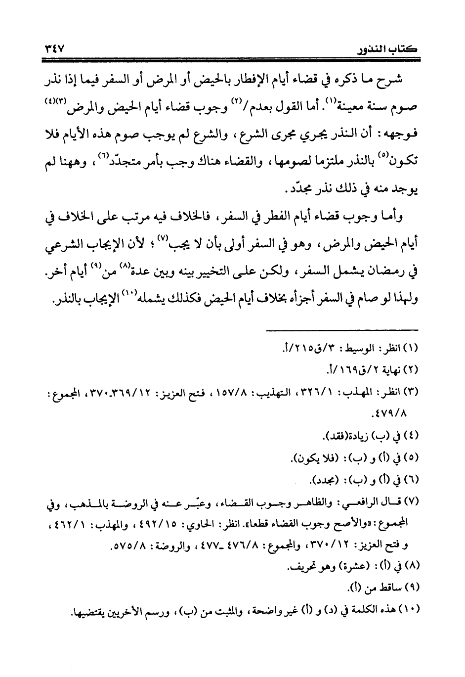 وأما وجوب قضاء أيام الفطر في السفر، فالخلاف فيه مرتب على الخلاف في أيام الحيض والمرض، وهو في السفر أولى بأن لا يجب (¬7)؛ لأن الإيجاب الشرعي في رمضان يشمل السفر، ولكن على التخيير بينه وبين عدة (¬8) من (¬9) أيام أخر. ولهذا لو صام في السفر أجزأه بخلاف أيام الحيض فكذلك يشمله (¬10) الإيجاب بالنذر.