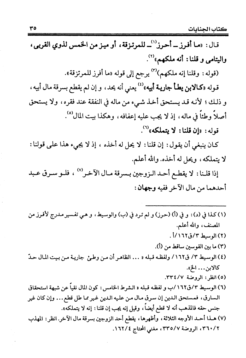 (¬7) هذا أحد الأوجه الثلاثة، وأظهرها، يقطع أحد الزوجين بسرقة مال الآخر. انظر: المهذب 2/ 360، الروضة 7/ 335، مغني المحتاج 4/ 162.
