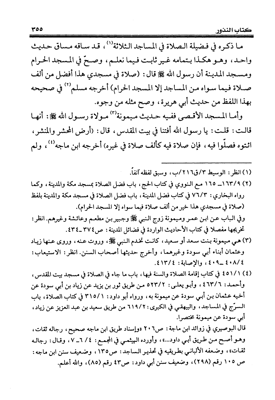 ما ذكره في فضيلة الصلاة في المساجد الثلاثة (¬1)، قد ساقه مساق حديث واحد، وهو هكذا بتمامه غير ثابت فيما نعلم، وصحّ في المسجد الحرام ومسجد المدينة أن رسول الله - صلى الله عليه وسلم - قال: (صلاة في مسجدي هذا أفضل من ألف صلاة فيما سواه من المساجد إلا المسجد الحرام) أخرجه مسلم (¬2) في صحيحه بهذا اللفظ من حديث أبي هريرة، وصح مثله من وجوه.