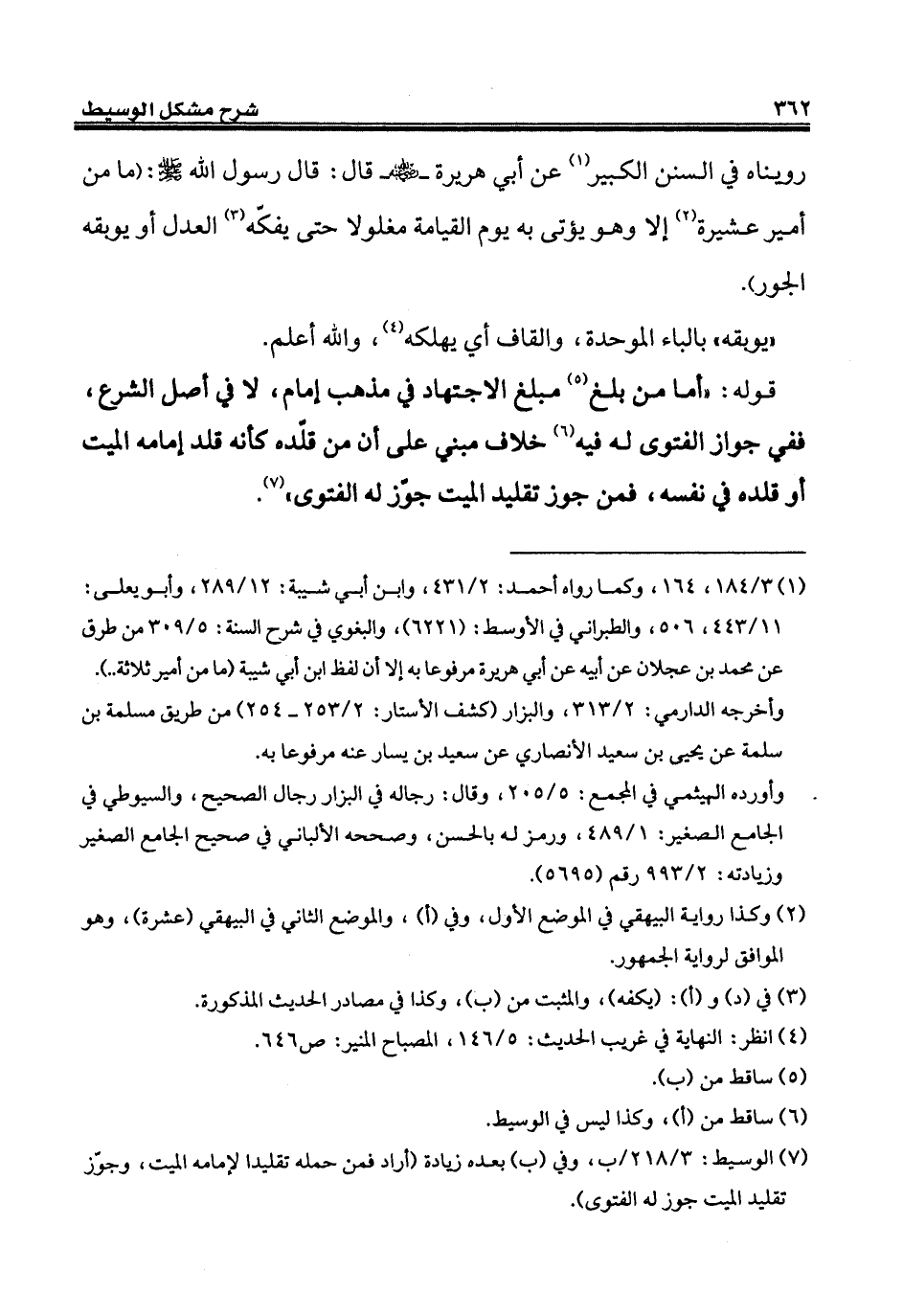 (¬7) الوسيط: 3/ 218/ ب، وفي (ب) بعده زيادة (أراد فمن حمله تقليدا لإمامه الميت، وجوّز تقليد الميت جوز له الفتوى).