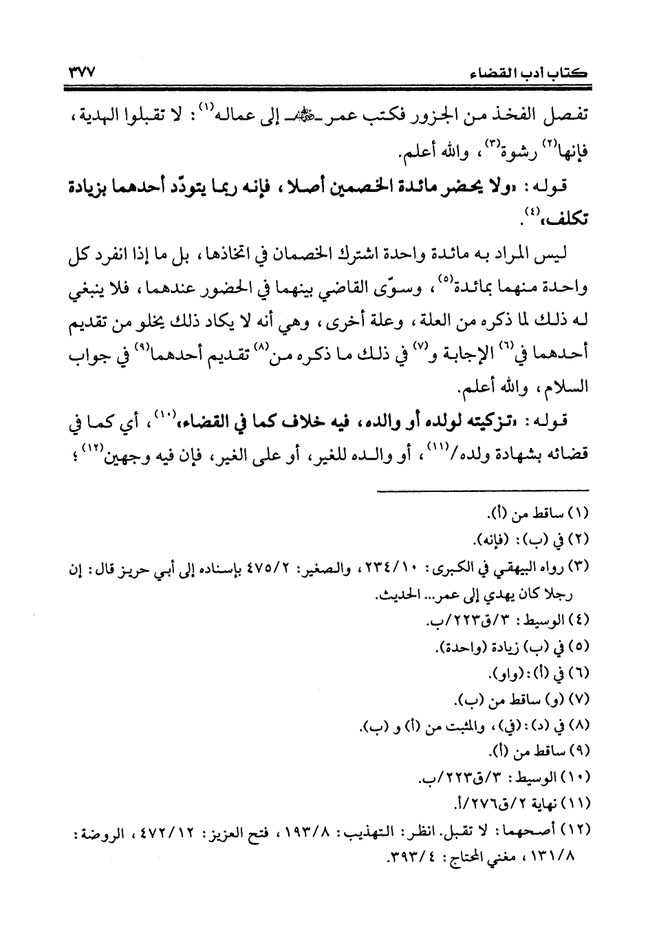ليس المراد به مائدة واحدة اشترك الخصمان في اتخاذها، بل ما إذا انفرد كل واحدة منهما بمائدة (¬5)، وسوّى القاضي بينهما في الحضور عندهما، فلا ينبغي له ذلك لما ذكره من العلة، وعلة أخرى، وهي أنه لا يكاد ذلك يخلو من تقديم أحدهما في (¬6) الإجابة و (¬7) في ذلك ما ذكره من (¬8) تقديم أحدهما (¬9) في جواب السلام، والله أعلم.