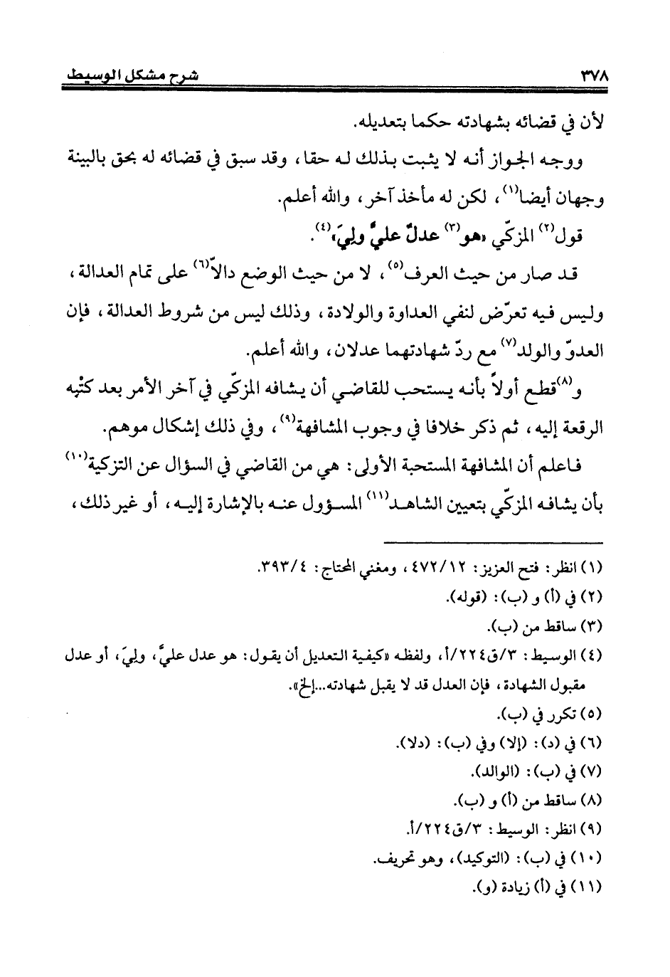 (¬4) الوسيط: 3/ ق 224/ أ، ولفظه "كيفية التعديل أن يقول: هو عدل عليَّ، ولِيَ، أو عدل مقبول الشهادة، فإن العدل قد لا يقبل شهادته ... إلخ".