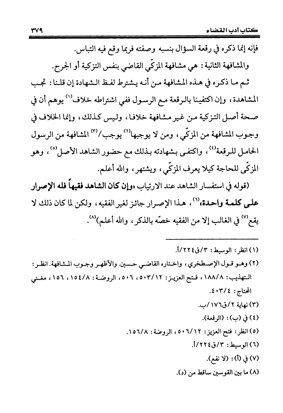 (قوله في استفسار الشاهد عند الارتياب "وإن كان الشاهد فقيهاً فله الإصرار على كلمة واحدة" (¬6)، هذا الإصرار جائز لغير الفقيه، ولكن لما كان ذلك لا يقع (¬7) في الغالب إلا من الفقيه خصّه بالذكر، والله أعلم) (¬8).