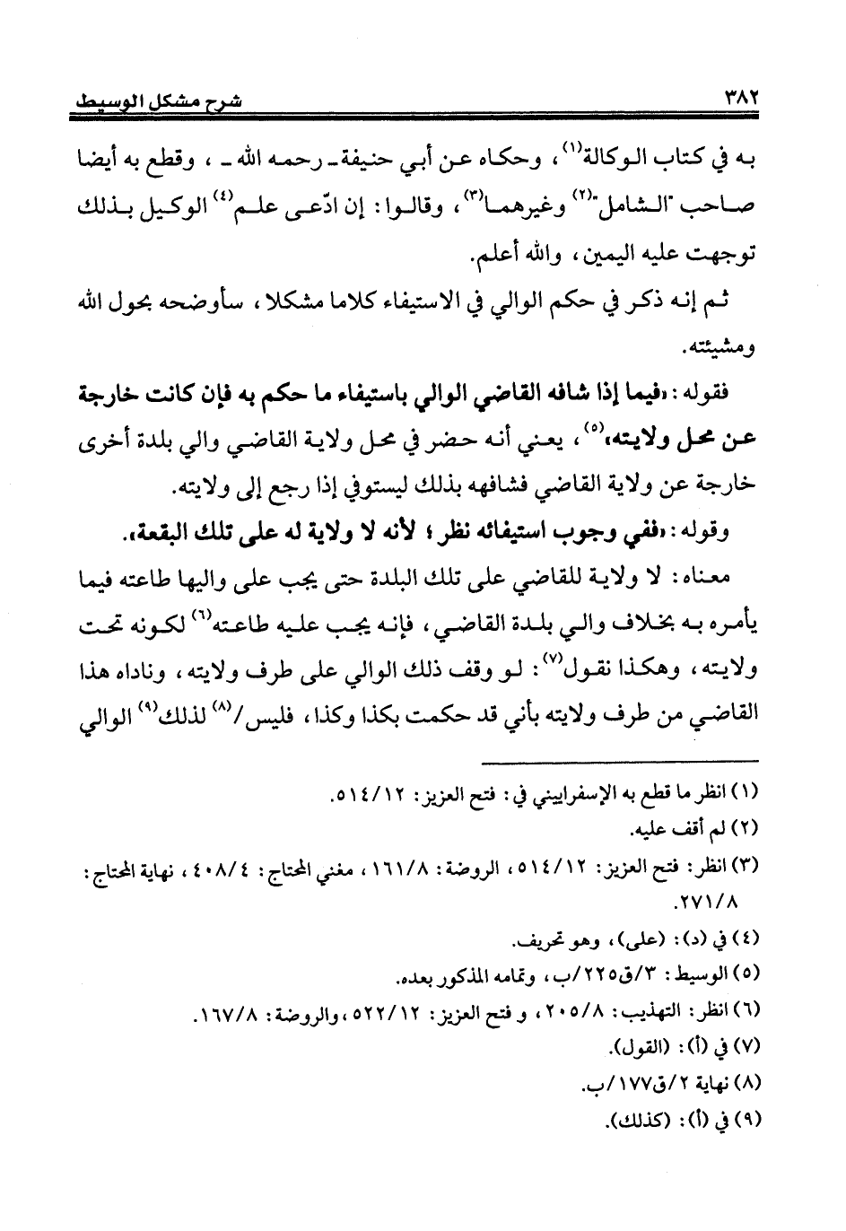 فقوله: "فيما إذا شافه القاضي الوالي باستيفاء ما حكم به فإن كانت خارجة عن محل ولايته" (¬5)، يعني أنه حضر في محل ولاية القاضي والى بلدة أخرى خارجة عن ولاية القاضي فشافهه بذلك ليستوفي إذا رجع إلى ولايته.