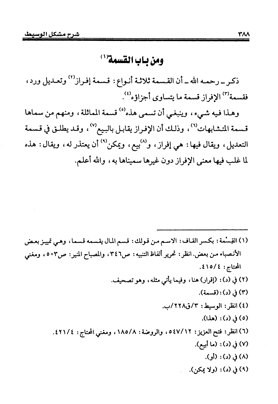 (¬1) القِسْمة: بكسر القاف: الاسم من قولك: قسم المال يقسمه قسما، وهي تمييز بعض الأنصباء من بعض. انظر: تحرير ألفاظ التنبيه: ص 346، والمصباح المنير: ص 503، ومغني المحتاج: 4/ 415.