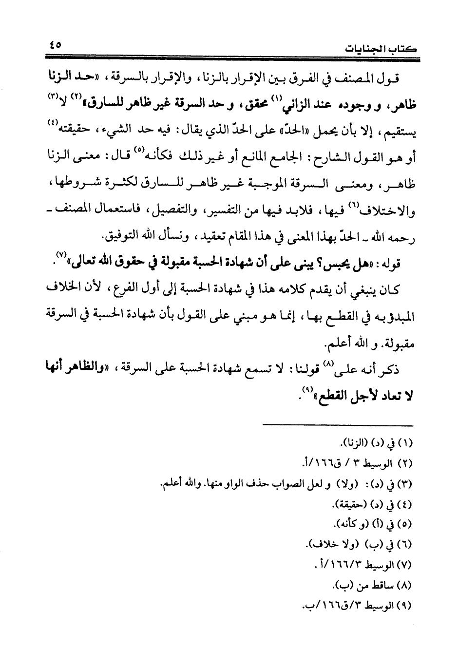 قول المصنف في الفرق بين الإقرار بالزنا، والإقرار بالسرقة، "حد الزنا ظاهر، ووجوده عند الزاني (¬1) محقق، وحد السرقة غير ظاهر للسارق" (¬2) لا (¬3) يستقيم، إلا بأن يحمل "الحدّ" على الحدّ الذي يقال: فيه حد الشيء، حقيقته (¬4) أو هو القول الشارح: الجامع المانع أو غير ذلك فكأنه (¬5) قال: معنى الزنا ظاهر، ومعنى السرقة الموجبة غير ظاهر للسارق لكثرة شروطها، والاختلاف (¬6) فيها، فلا بد فيها من التفسير، والتفصيل، فاستعمال المصنف - رحمه الله - الحدّ بهذا المعنى في هذا المقام تعقيد، ونسأل الله التوفيق.