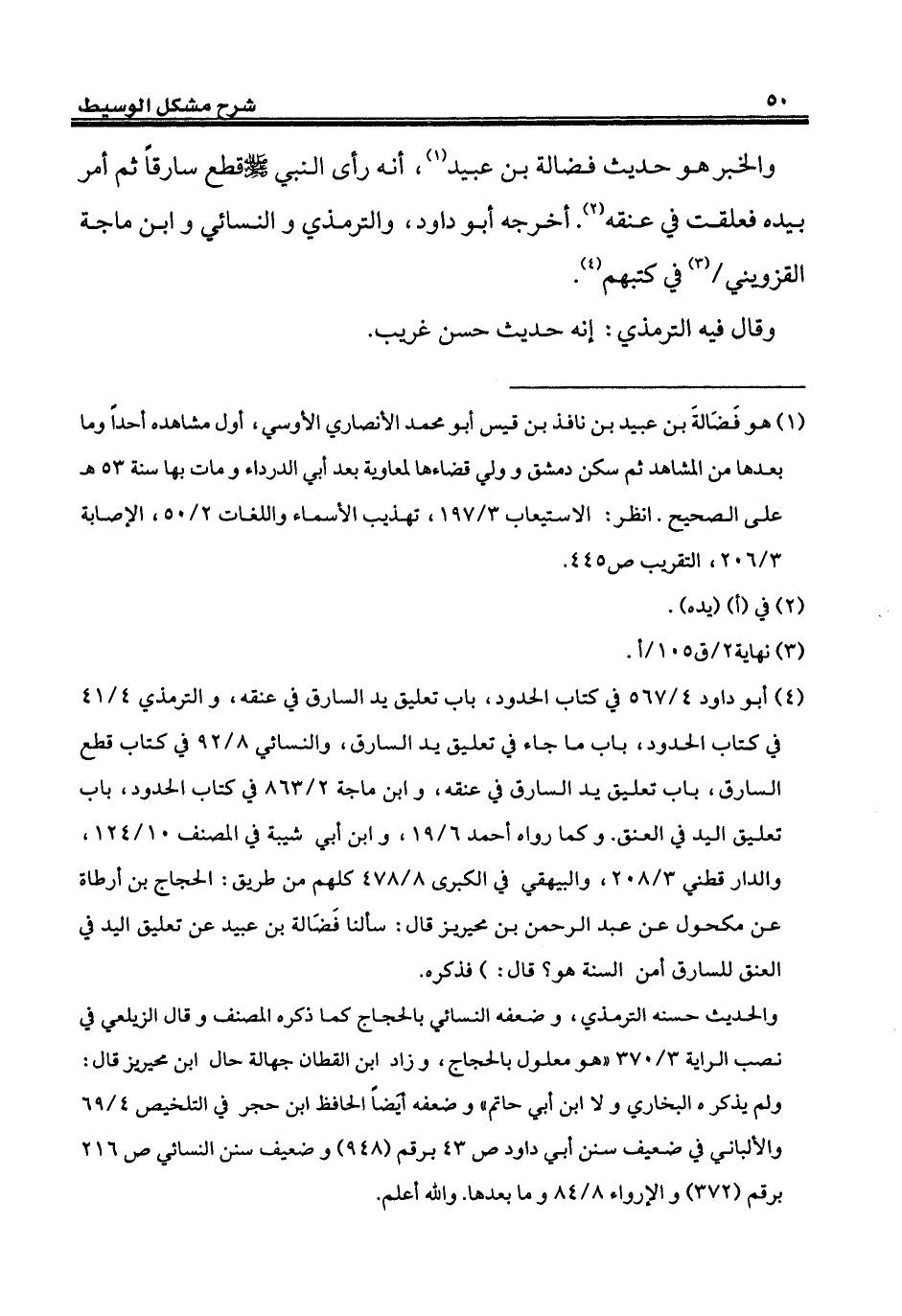 (¬4) أبو داود 4/ 567 في كتاب الحدود، باب تعليق يد السارق في عنقه، والترمذي 4/ 41 في كتاب الحدود، باب ما جاء في تعليق يد السارق، والنسائي 8/ 92 في كتاب قطع السارق، باب تعليق يد السارق في عنقه، وابن ماجة 2/ 863 في كتاب الحدود، باب تعليق اليد في العنق. وكما رواه أحمد 6/ 19، وابن أبي شيبة في المصنف 10/ 124، والدارقطني 3/ 208، والبيهقي في الكبرى 8/ 478 كلهم من طريق: الحجاج بن أرطاة عن مكحول عن عبد الرحمن بن محيريز قال: سألنا فَضَالة بن عبيد عن تعليق اليد في العنق للسارق أمن السنة هو؟ قال:) فذكره.