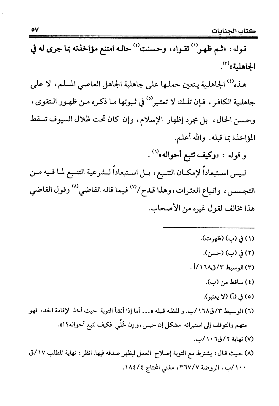 (¬6) الوسيط 3/ ق 168/ ب. ولفظه قبله " ... أما إذا أنشأ التوبة حيث أخذ لإقامة الحد، فهو متهم والتوقف إلى استبرائه مشكل إن حبس، وإن خُلَّي فكيف نتبع أحواله؟! ".