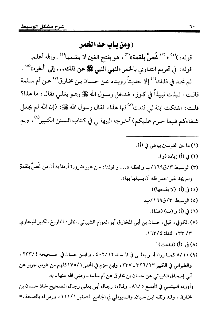(¬3) الوسيط 3/ ق 169/ ب ولفظه " ... وقولنا: من غير ضرورة أردنا به أن من غَصَّ بلقمةٍ ولم يجد غير الخمر فله أن يسيغها بها".