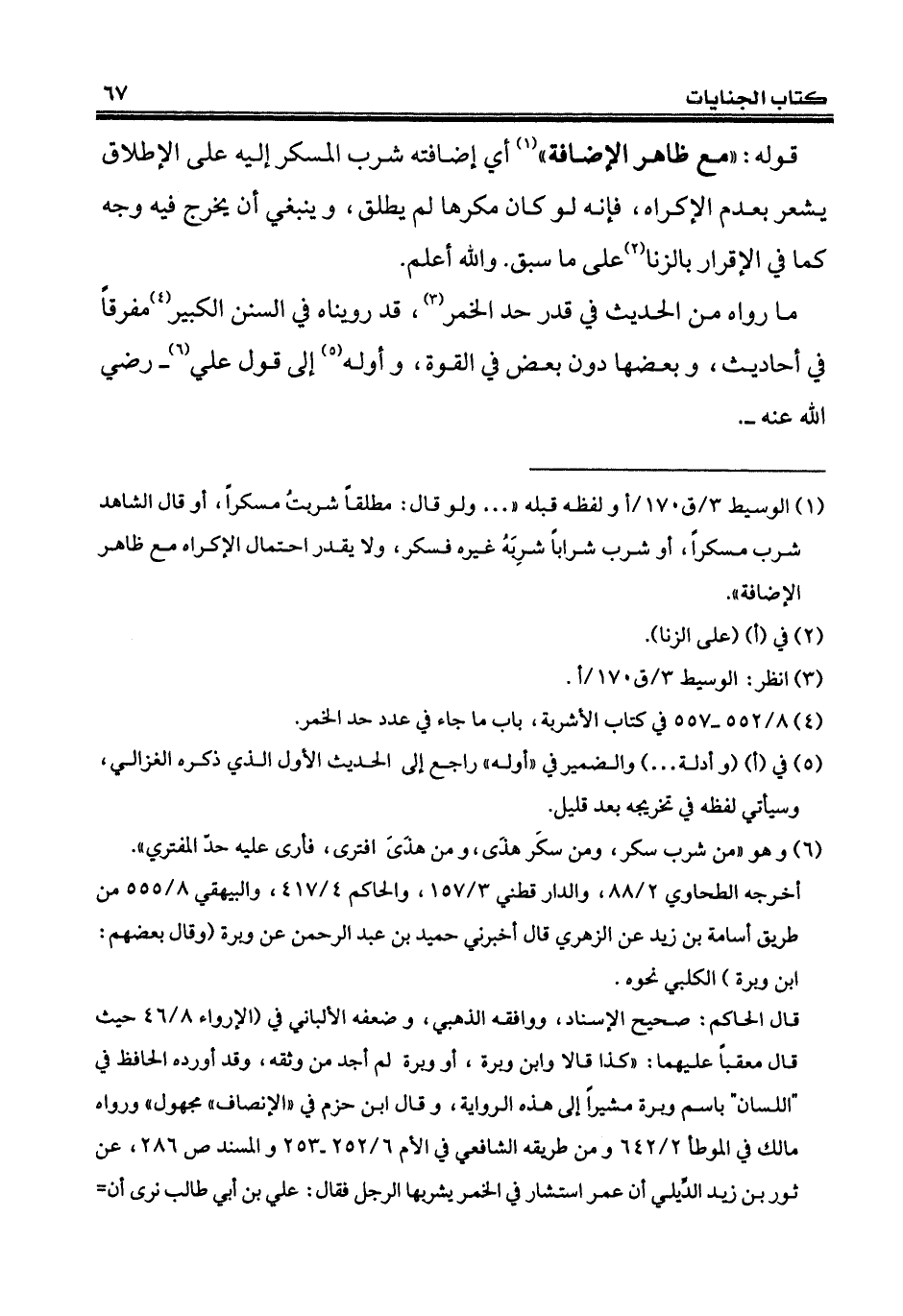 (¬1) الوسيط 3/ ق 170/ أولفظه قبله " ... ولو قال: مطلقاً شربتُ مسكراً، أو قال الشاهد شرب مسكراً، أو شرب شراباً شرِبَهُ غيره فسكر، ولا يقدر احتمال الإكراه مع ظاهر الإضافة".