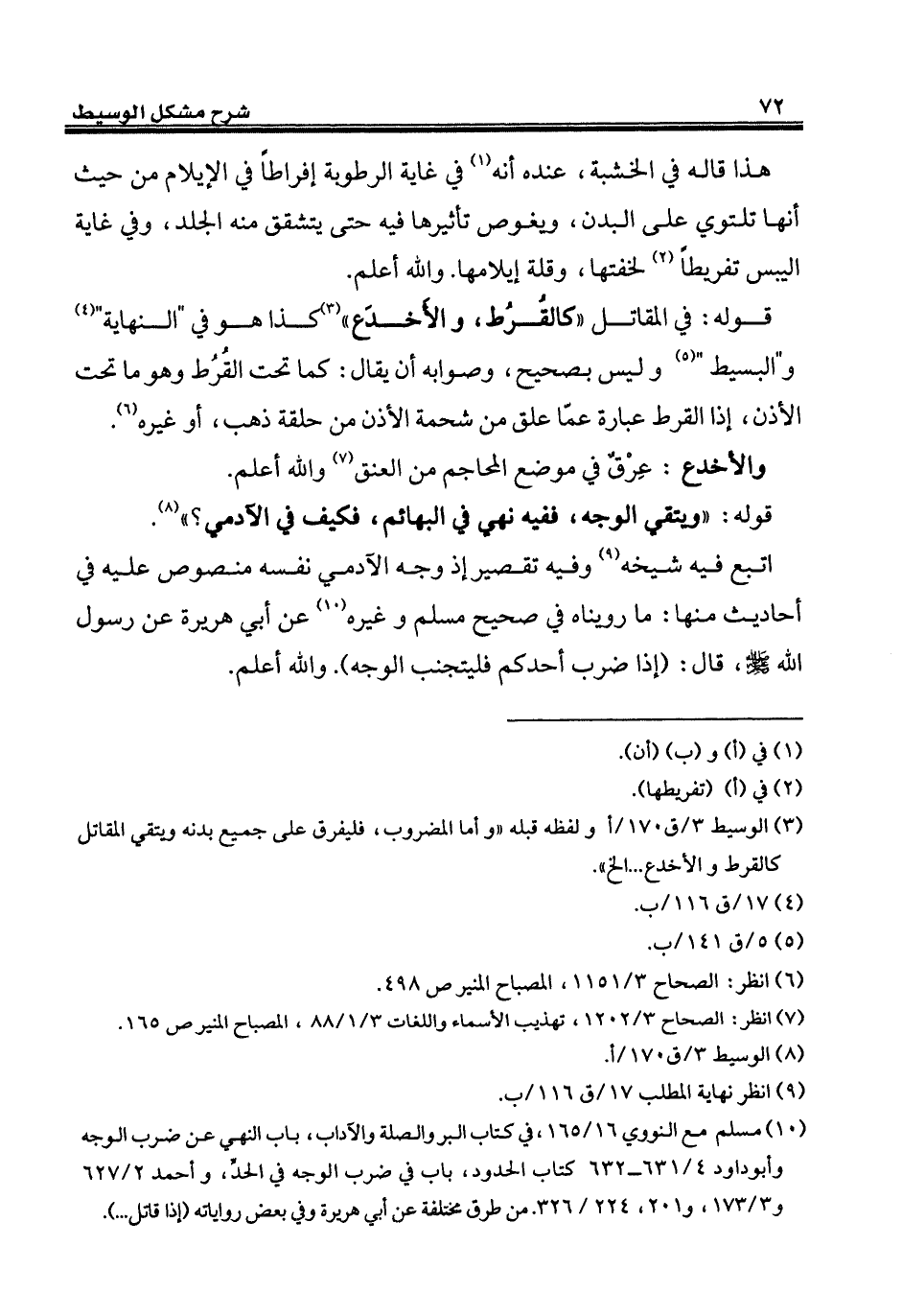 (¬3) الوسيط 3/ ق 170/ أولفظه قبله "وأما المضروب، فليفرق على جميع بدنه ويتقي المقاتل كالقرط والأخدع ... إلخ".